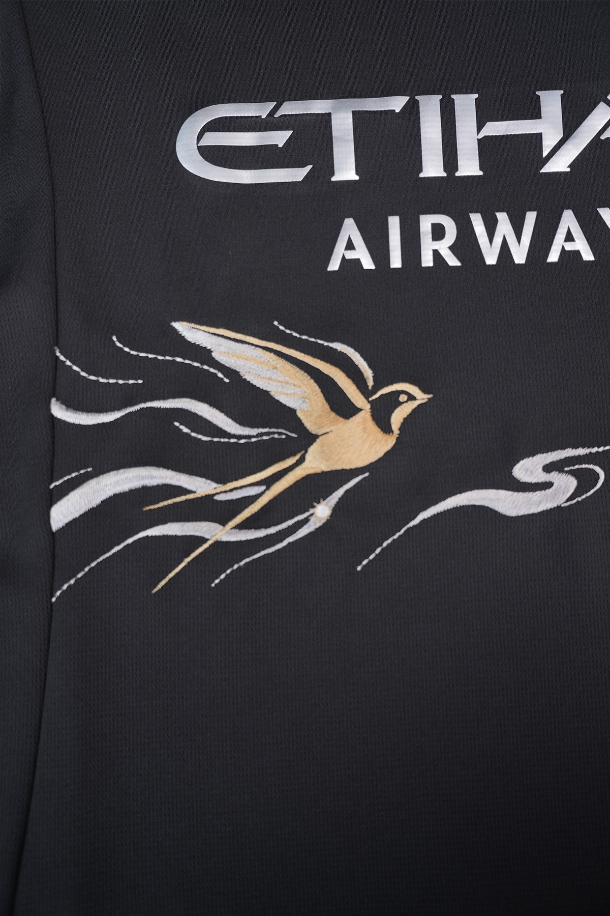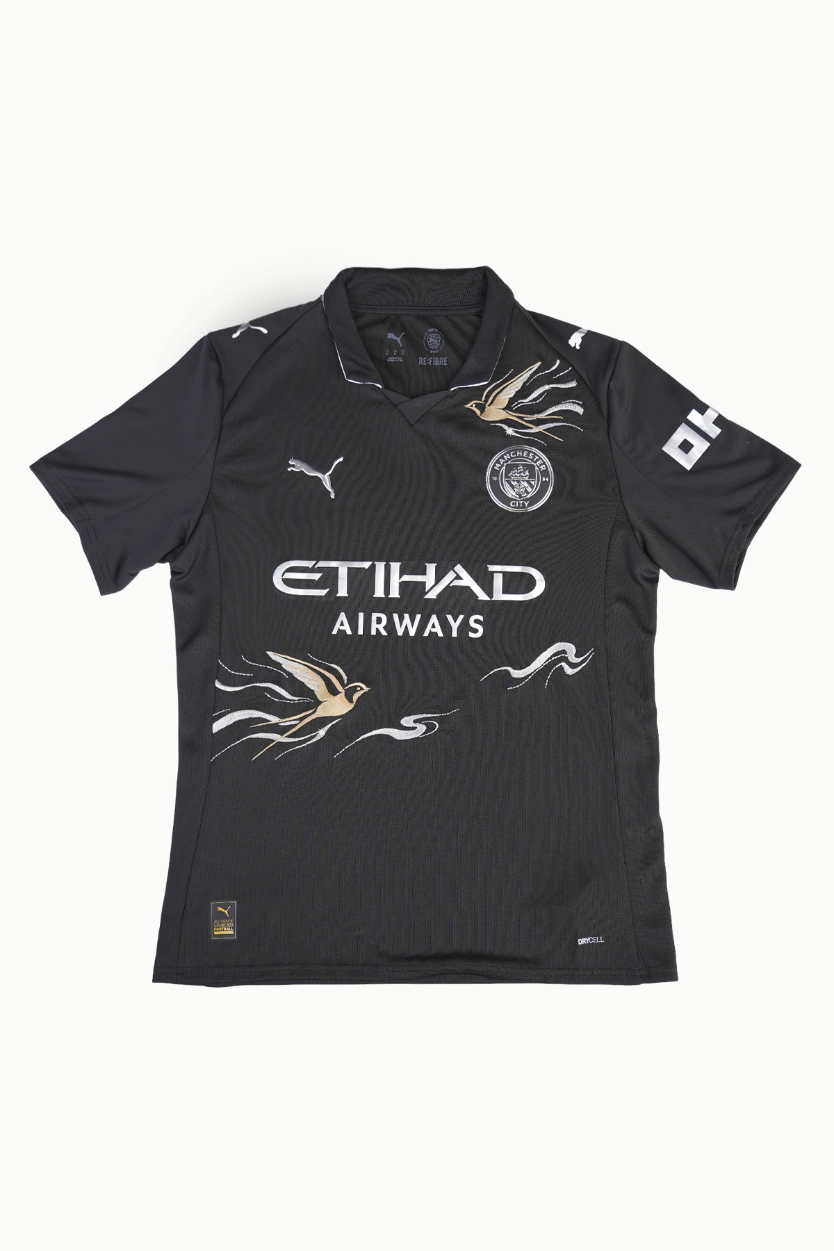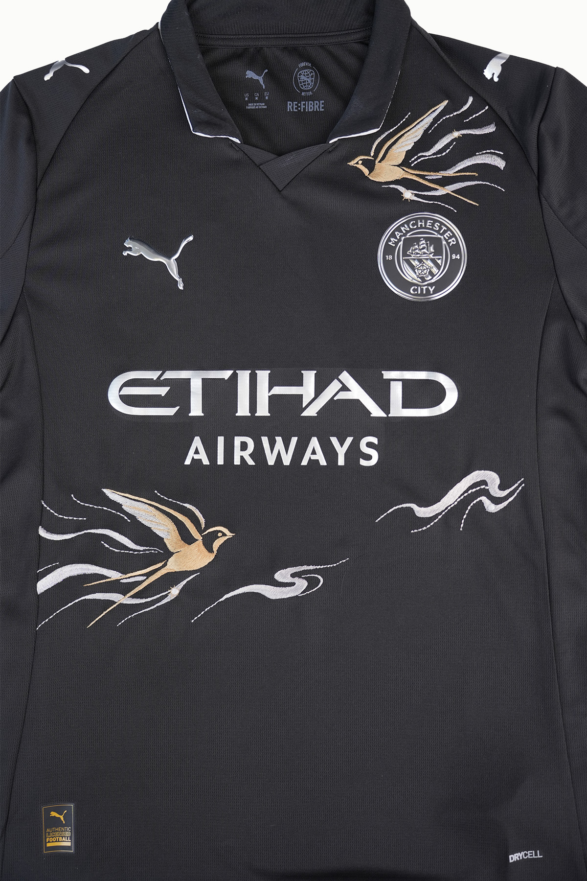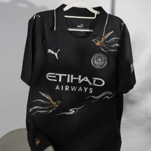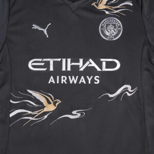 This design is based on the Manchester City black jersey, with brilliant gold as the brush strokes and embroidered with light flying swallows.